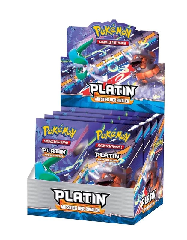 Display mit insgesamt 8 Decks der Pokémon Serie Aufstieg der Rivalen in Deutsch. Das Display enthält 4 x 2 unterschiedliche Decks: Bohrhammer (Rihornior) und Schneidklinge (Galagladi). Jedes Deck enthält 60 Pokémon Sammelkarten, 1 Münze, 1 Regelbuch und 1 Spielunterlage.
